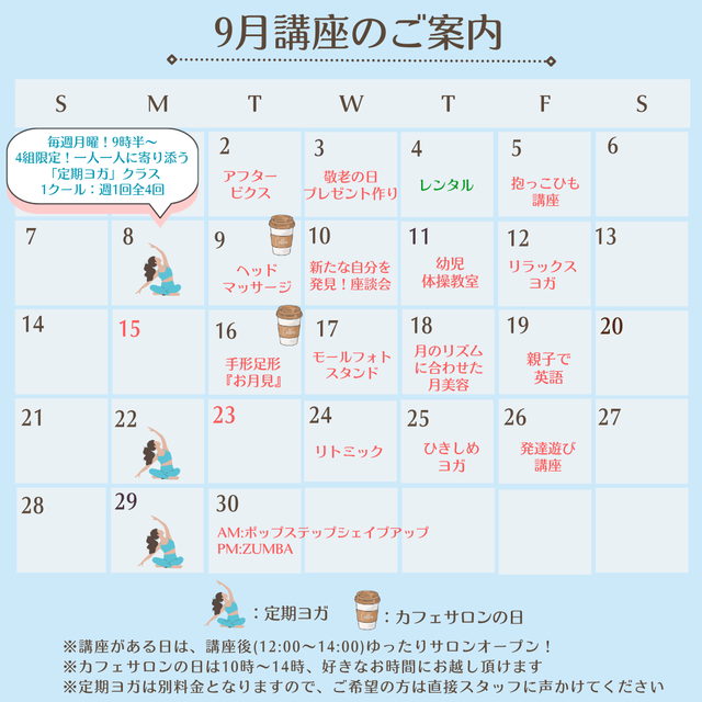 ★各種講座は10時~始まります。講座終了後はゆったりサロン(500円)でランチやおしゃべりなど、サロンをご利用頂けます。